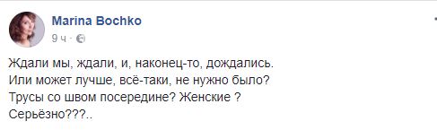 "Ждали мы, ждали, и, наконец-то, дождались. Или может лучше, всё-таки, не нужно было? Трусы со швом посередине? Женские? Серьёзно???", - вопрошает Марина Бочко из батальона им. Кульчицкого.