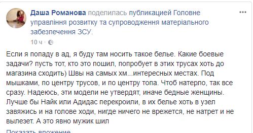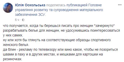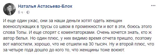 "И еще один ужас, они за наши деньги хотят одеть женщин военослужащих в трусы со швом в промежности и вот в эти, боюсь этого слова Топы. И еще спорят с коментаторками. Очень хочется знать, кто ж автор белья. Но один плюс, у них видимо время отчета пришло, поэтому вот напостили, хорошо, что не отшили на 30 тысяч. Ну и второй плюс, что за четыре года дошло до кого то, что женщины тоже воюют", - пишет херсонская активистка Наталья Астасьева-Блок.