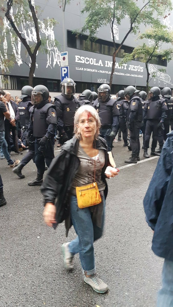 10:39 Окровавленная сторонница референдума, которая дралась с полицейским на видео ниже. Название избирательного участка совпадает с фамилией президента Каталонии - Пуджемонт. Это здание одной из центральных школ, где проходит референдум.