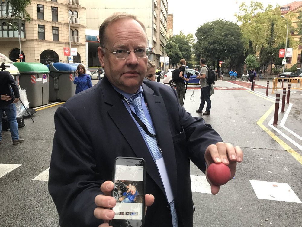 15:05 Член британской палаты лордов Крис Реннард нашел на улицах Барселоны резиновую пулю. Лорд присутствует в Каталонии как наблюдатель.