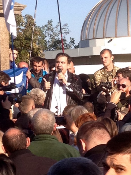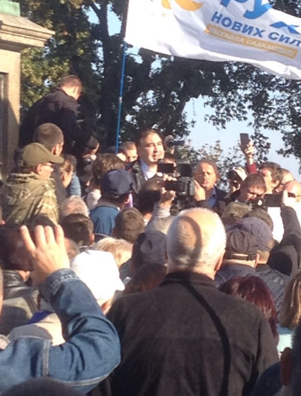 Саакашвили прибыл к памятнику Дюку, его пытаются заглушить противники