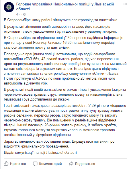 В пятницу, 30 сентября, в Старосамборском районе Львовской области столкнулись электропоезд и грузовик. Об этом сообщает пресс-служба Нацполиции региона в Facebook.