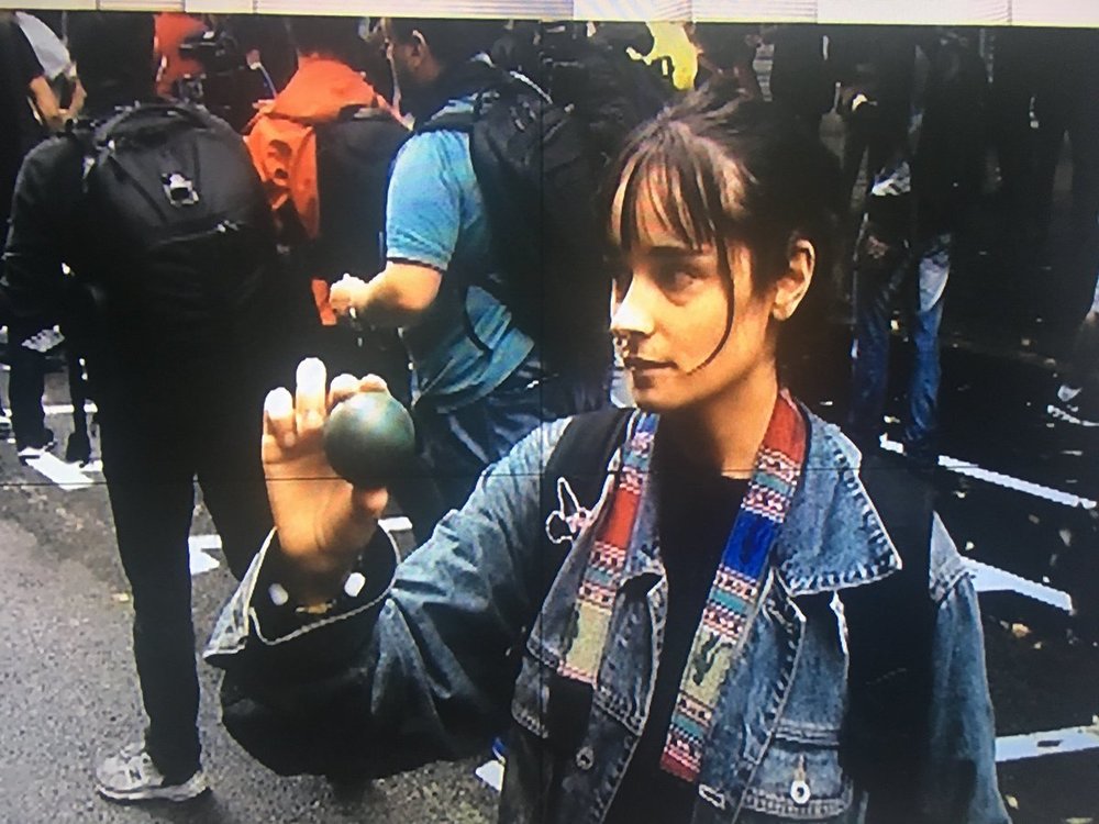 Вот полицейские штурмуют один из центральных избирательных участков Барселоны. "Под раздачу" попадает пожилая активистка.