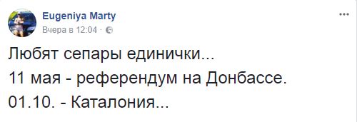 Евгения Мартынова, донецкий блогер: "Любят сепары единички... 11 мая - референдум на Донбассе. 01.10. - Каталония..."