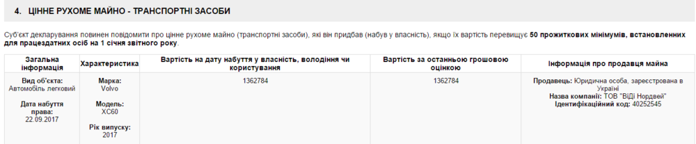 Согласно документу, стоимость внедорожника на момент покупки составляла 1 млн 362 тыс. 784 грн.