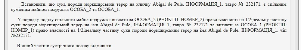 В порядке раздела общего имущества супругов судья Пересунько признал за каждым членом семьи "право собственности на ½ идеальную часть суки породы йоркширский терьер по имени Abigal de Pule".