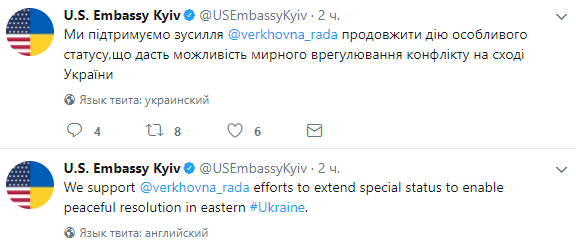Соединенные Штаты Америки "поддерживают усилия Верховной Рады Украины", направленные на продление действия закона "Об особом порядке местного самоуправления в отдельных районах Донецкой и Луганской областей". Об этом говорится в сообщении посольства в Twitter.