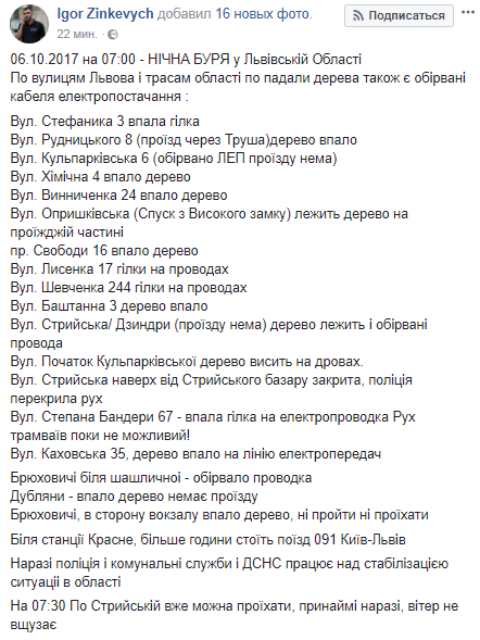 "По улицам Львова и трассам области попадали деревья, также оборваны кабеля электроснабжения", — написал Зинкевич.