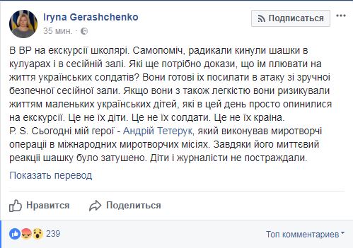 "В ВР на экскурсии школьники. Самопомощь, радикалы бросили шашки в кулуарах и сессионном зале. Какие еще нужны доказательства, что им плевать на жизни украинских солдат? Они готовы их посылать в атаку из удобного безопасного сессионного зала. Если они с такой легкостью рисковали жизнью маленьких украинских детей, которые в этот день просто оказались на экскурсии. Это не их дети. Это не их солдаты. Это не их страна", - написала Геращенко.