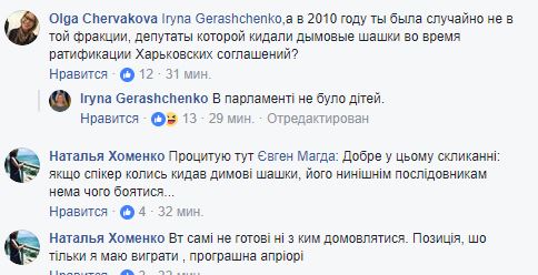 "Iryna Gerashchenko,а в 2010 году ты была случайно не в той фракции, депутаты которой кидали дымовые шашки во время ратификации Харьковских соглашений?", - написала в Facebook народный депутат Ольга Червакова.