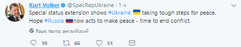 "Продолжение специального статуса показывает, что Украина делает жесткие шаги для мира. Надеюсь, теперь Россия будет действовать, чтобы воцарился мир - время закончить конфликт", - написал Волкер.