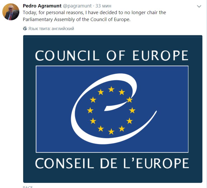 Президент Парламентской ассамблеи Совета Европы (ПАСЕ) Педро Аграмунт добровольно подал в отставку. Об этом он сообщил на своей странице в Twitter.