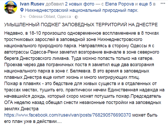 По мнению специалистов, обсуждающих сейчас в социальных сетях информацию о пожаре, в Нижнеднестровском национальном парке "не действуют законы Украины, в пределах парка - охотничьи угодья".