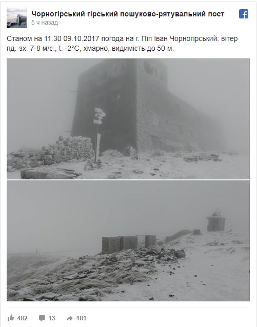 "По состоянию на 11:30 09.10.2017 погода в г. Поп-Иван Черногорский: ветер юж.-зап. 7-8 м/сек., t. -2 С, облачно", - сообщают спасатели.