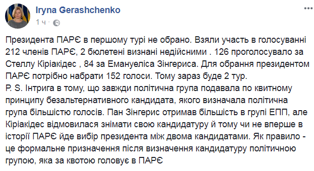Избрать нового президента Парламентской Ассамблеи Совета Европы (ПАСЕ) в первом туре не удалось. Лидерами голосования стали Стелла Кириакидес из Кипра и представитель Литвы Эмануэлис Зингерис. Об этом на Facebook-странице сообщила первый заместитель председателя Верховной Рады Ирина Геращенко.