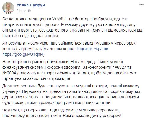 "Бесплатная медицина в Украине - это многолетняя ложь, ведь в больницах платят все. И дорого. Каждому второму украинцу не под силу оплатить стоимость "бесплатного" лечения, поэтому он отказывается от него", - пишет она.