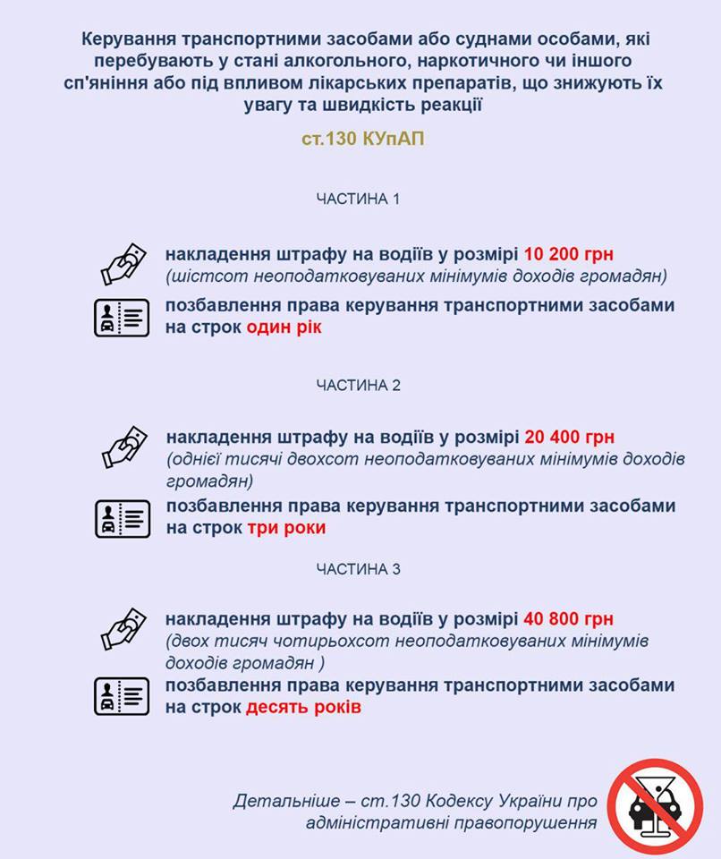 На всех правонарушителей правоохранители составили админпротоколы по ст.130 КУоАП (управление транспортными средствами лицами, находящимися в состоянии алкогольного, наркотического или другого опьянения или под воздействием лекарственных препаратов, снижающих их внимание и скорость реакции).