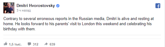 На официальной странице Хворостовского также появилось опровержение. Там говорится, что певец жив и находится в Лондоне, где собирается с родителям отметить свой день рождения (16 октября - ред.).