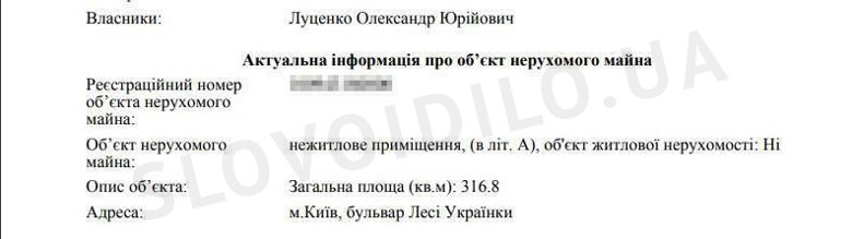 Также в Реестре недвижимого имущества на Александра Луценко зарегистрировано нежилое помещение в центре Киева (бул. Леси Украинский) площадью 316,8 кв. м.