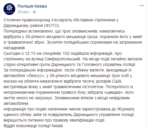 "Сегодня в 12:13 по спецлинии 102 поступила информация о стрельбе на улице Симферопольской. На место происшествия немедленно выехали следственно-оперативные группы Дарницкого и Главного управлений полиции", - говорится в сообщении. Согласно информации пресс-службы, предварительно после обмена валюты, когда 28-летний местный житель выходил из автомобиля Lexus, три человека в масках на лице пытались отобрать у него тысячу долларов, выстрелив ему в живот травматическим пистолетом. Так, пострадавшего с непроникающим ранением правой стороны забрала "скорая", в данный момент его жизни ничего не угрожает.
