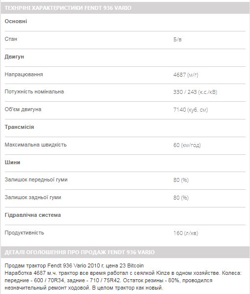 Модель Fendt 936 Vario 2010 года предлагают купить за 23 биткоина. По состоянию на 12 октября один биткоин можно приобрести за $4 732, а, следовательно, стоимость трактора составляет около $109 000.