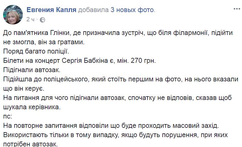 "К памятнику Глинки, где назначила встречу, что у филармонии, подойти не смогла, он за решеткой. Рядом много полиции. Билеты на концерт Сергея Бабкина есть, мин. 270 грн. Подогнали автозак", - написала активистка.