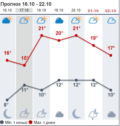 Сайт Gismeteо обещает +19 днем и ясные дни без осадков.