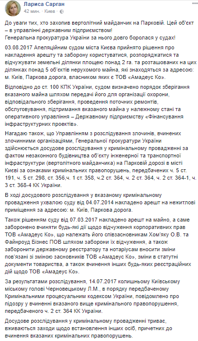 В Генпрокуратуре отреагировали на захват вертолетной площадки на Парковой. Об этом сообщает пресс-секретарь ГПУ Лариса Сарган на своей странице в Facebook.