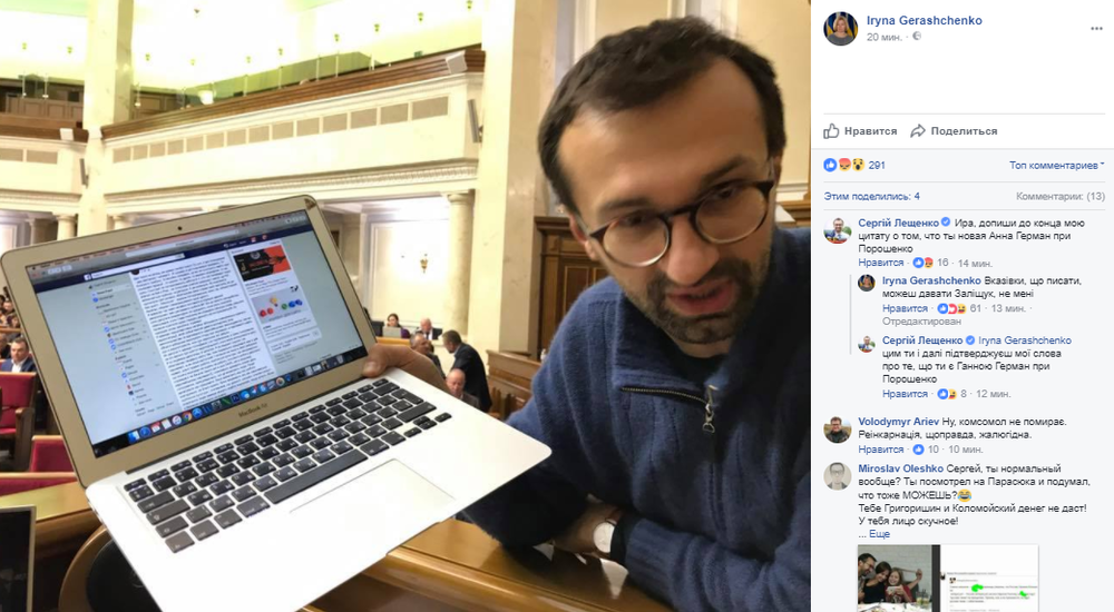 Так, народный депутат Ирина Геращенко заявила на своей странице в Facebook о неприятном разговоре с коллегой Сергеем Лещенко. Мол, нардеп подошел к ней и не сдерживая слов обвинил в постах в соцсетях, за которые "должно быть стыдно".