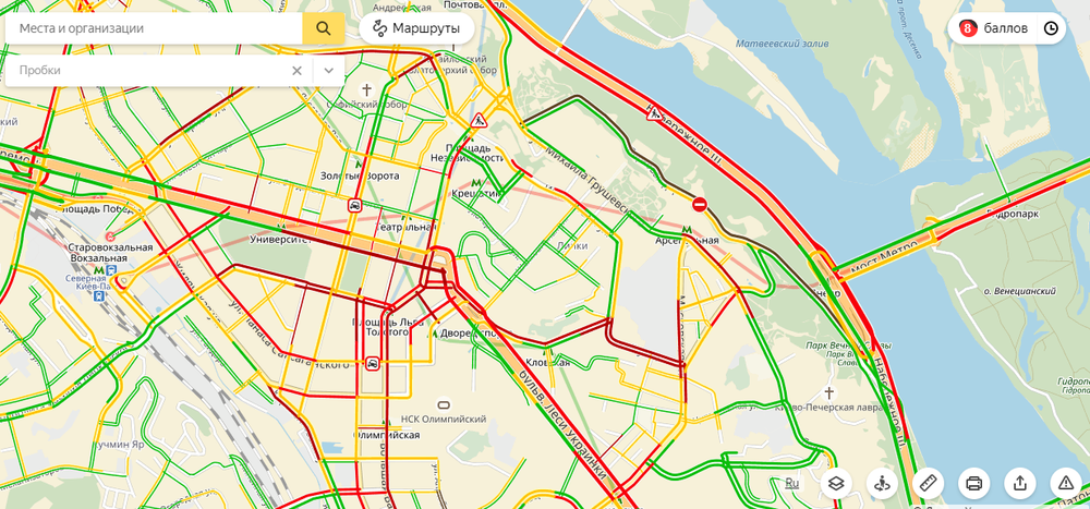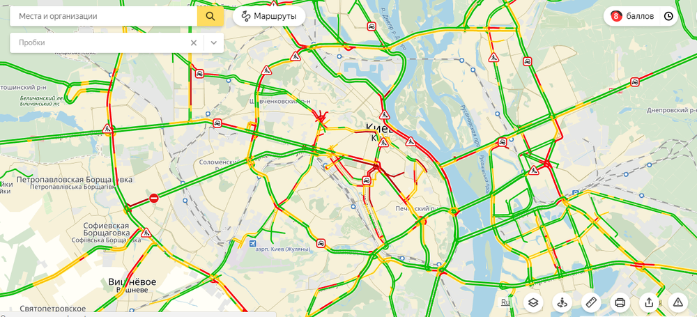В Киеве 17 октября вечером пробки достигли 8 баллов. Наибольшие затруднения для проезда наблюдаются в центре города. Практически не едет бульвар Тараса Шевченко, традиционно "тянутся" Крещатик и Бессарабская площадь.