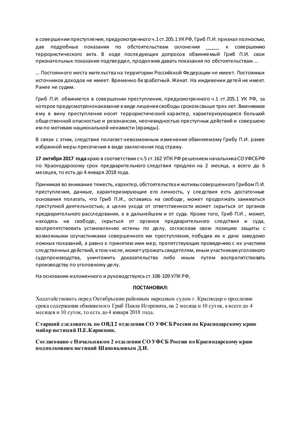 ""В период с 27 марта до 13 апреля 2017 Гриб П. И., который является сторонником экстремисткой организации УНА-УНСО, руководствуясь идеями супремасизма (по признакам этнической группы и культуры) сегрегации, находясь на территории Украины, путем передачи текстовых сообщений на украинском языке в программе "Skype", содержащие убеждению, предложения, призывы к чувствам максимализма, исключительности и значимости, чувством превосходства Украинский над русскими, а также к чувствам мести за якобы бывшие и имеющиеся факты оккупации Россией исконно украинских зе мель, обратился к ___ с целью побудить ее изготовить СВП, осуществить его закладку в здании МОУ СОШ №__ м. Сочи Краснодарского края и приведения в действие 30 июля 2017 на выпускной линейке с целью дестабилизации органов власти и влияния на принятие ими решений о статусе отдельных областей Российской Федерации, то есть осуществить террористический акт с причинением значительного ущерба, наступления иных тяжких последствий, а также умышленного причинения смерти человеку ", - говорится в постановлении.