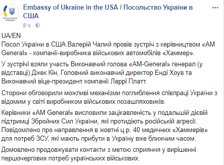 "Руководители AM General выразили заинтересованность в дальнейшем действенной поддержке Вооруженных сил Украины, которые противодействуют российской агрессии. Они сообщили, что в октябре этого года для нужд ВСУ отправлены 40 медицинских "Хаммеров" , которые должны прибыть в Украину уже в ближайшее время", - говорится в сообщении.