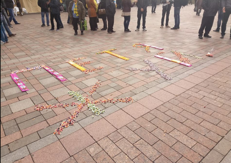 На площади перед Верховной Радой участники МихоМайдана выложили послание Петру Порошенко конфетами "Рошен". Об этом сообщает корреспондент "Страны".