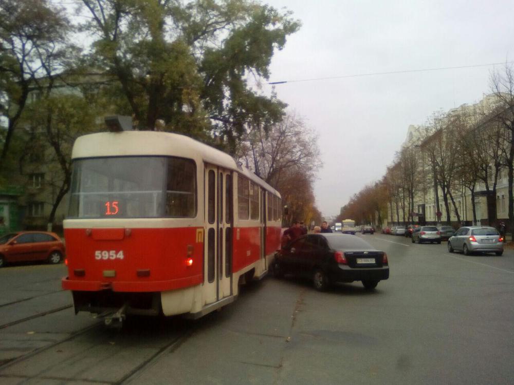 Согласно информации, на ул. Дегтяревской трамвай № 15, курсирующий от улицы Старовокзальной до Автогенного завода, столкнулся с автомобилем Chevrolet.