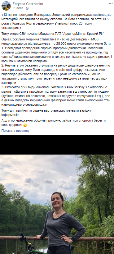 Когда СБУ пришла на комбинат, Зоряна написала пост. В нем она заявила, что масштаб онкологических заболеваний в городе не так уж и велик, как утверждает власть. И предположила, что статистику намеренно завысили.
