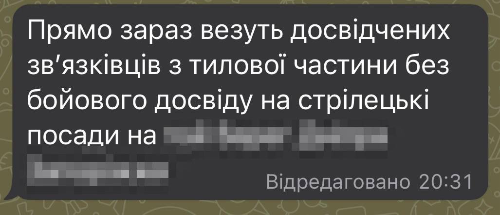14.51 Перевод боевых медиков и других специалистов, в частности, связистов, в пехоту продолжается. Об этом заявляет нардеп Марьяна Безуглая и публикует соответствующие заявления.