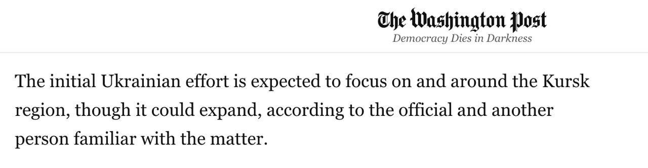 "Первоначальные украинские усилия, как ожидается, будут сосредоточены на Курской области и вокруг нее, хотя они могут быть расширены", - пишет издание.