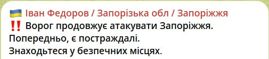 21.58 В Запорожье есть пострадавшие после атаки "Шахедов", сообщает глава ОВА Федоров.