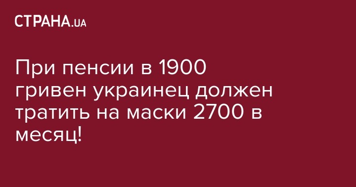 Скільки гривень за рік карантину має витратити українець на маски. Маску звичайну медичну за 15 гривень необхідно міняти кожні дві години, тобто за 12 годин (нічні години не рахуємо) використовуємо 6 масок. Множимо 6 на 365 днів отримуємо 2190 масок, множимо на 15 гривень, отримуємо 32850 гривень на рік повинен витратити українець на одну особу тільки на маски!!! Так пенсія 1900 гривень на місяць, а на маски на місяць потрібно витратити 2700 гривень"