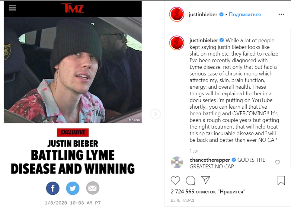 "В то время как многие люди продолжали говорить, что Джастин Бибер выглядит как дерьмо, о метамфетамине и т. д., они не в курсе, что мне недавно был поставлен диагноз болезнь Лайма", - написал певец.