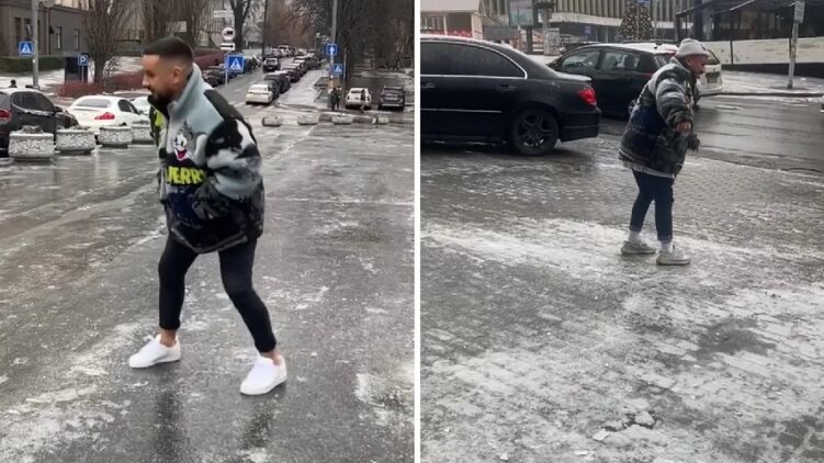 Известный украинский певец, хореограф и судья проекта "Танцы со звездами" Монатик станцевал в стиле шаффл на покрытой льдом улице Киева.