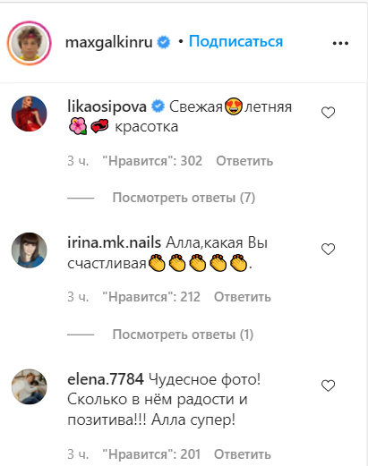 В комментариях пользователи оставили много восхищенных комментариев: "Огооо! Класс", "Как выглядит счастливая женщина, прям огонь в глазах", "Прекрасная Алла", "Какая красавица Алла Борисовна! Вся светится от счастья и любви", "Свежая летняя красотка", "Алла, какая Вы счастливая", "Чудесное фото! Сколько в нём радости и позитива", - пишут пользователи под фото.