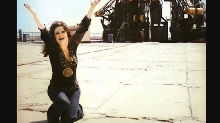 В конце 1970-х Пугачева, которой тогда было 28 лет, побывала на космодроме. Фотограф запечатлел звезду в модной по тем временам кофточке в этно-стиле и джинсах. Алла Борисовна позировала на одном колене, вскинув руки вверх, на фоне стартовых конструкций.