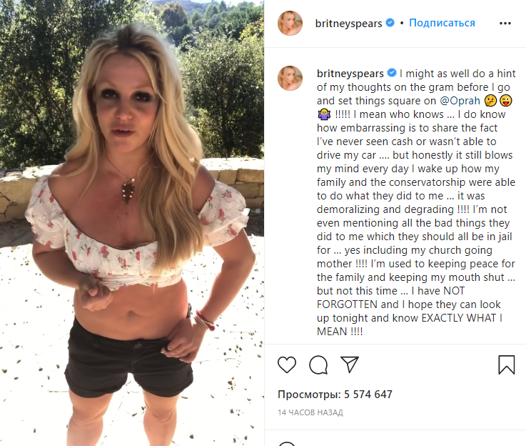 "Честно говоря, я до сих пор каждый день просыпаюсь и удивляюсь тому, как моя семья и опекуны смогли сделать это со мной. Это деморализует и унижает меня. Я даже не говорю обо всех плохих вещах, которые они сделали со мной, - за это они должны быть в тюрьме. Да, включая мою набожную мать", - заявила Бритни Спирс.
