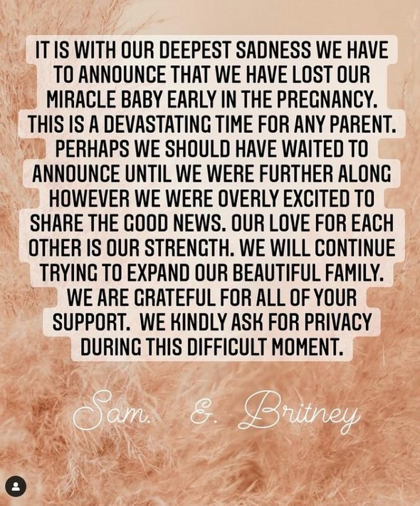"С глубочайшим прискорбием мы вынуждены сообщить, что потеряли нашего чудо-ребенка на раннем сроке беременности. Это страшное время для любого родителя. Возможно, нам стоило немного подождать с объявлением новости о беременности, но мы были так взволнованы, что хотели поскорее поделиться чем-то хорошим. Наша любовь друг к другу — наша сила. Мы продолжим попытки расширить нашу прекрасную семью. Мы благодарим за огромную поддержку и просим дать нам время побыть наедине в этот сложный период", — говорится в совместном посте Бритни и ее жениха Сэма Асгари.