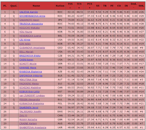 Турнирная таблица по итогам короткой программы (в финал выходят первые 15 мест):