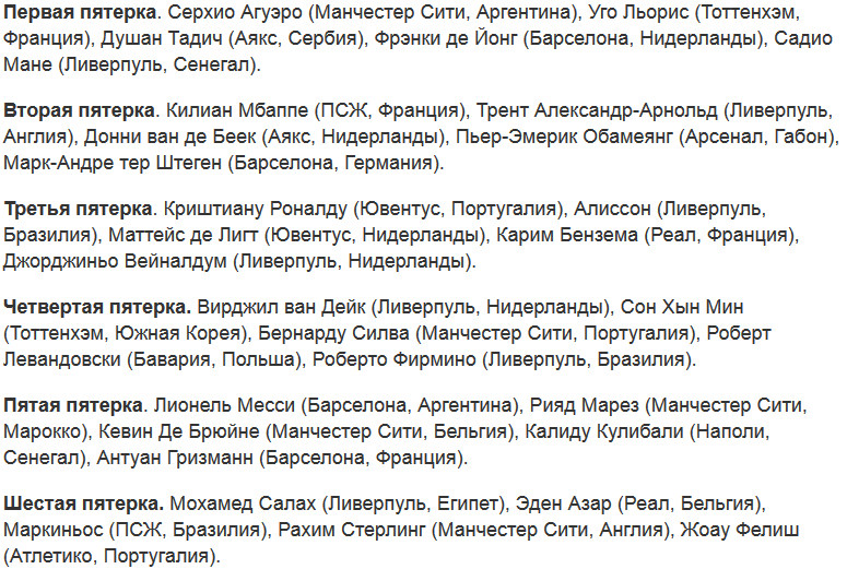 Алисон Бекер (Ливерпуль), Мануэль Нойер (Бавария), Андре Онана (Аякс), Войцех Щенсны (Ювентус), Ян Облак (Атлетико), Кепа Аррисабалага (Челси), Самир Ханданович (Интер), Уго Льорис (Тоттенхэм Хотспур), Марк-Андре тер Штеген (Барселона) и Эдерсон Мораес (Манчестер Сити).
