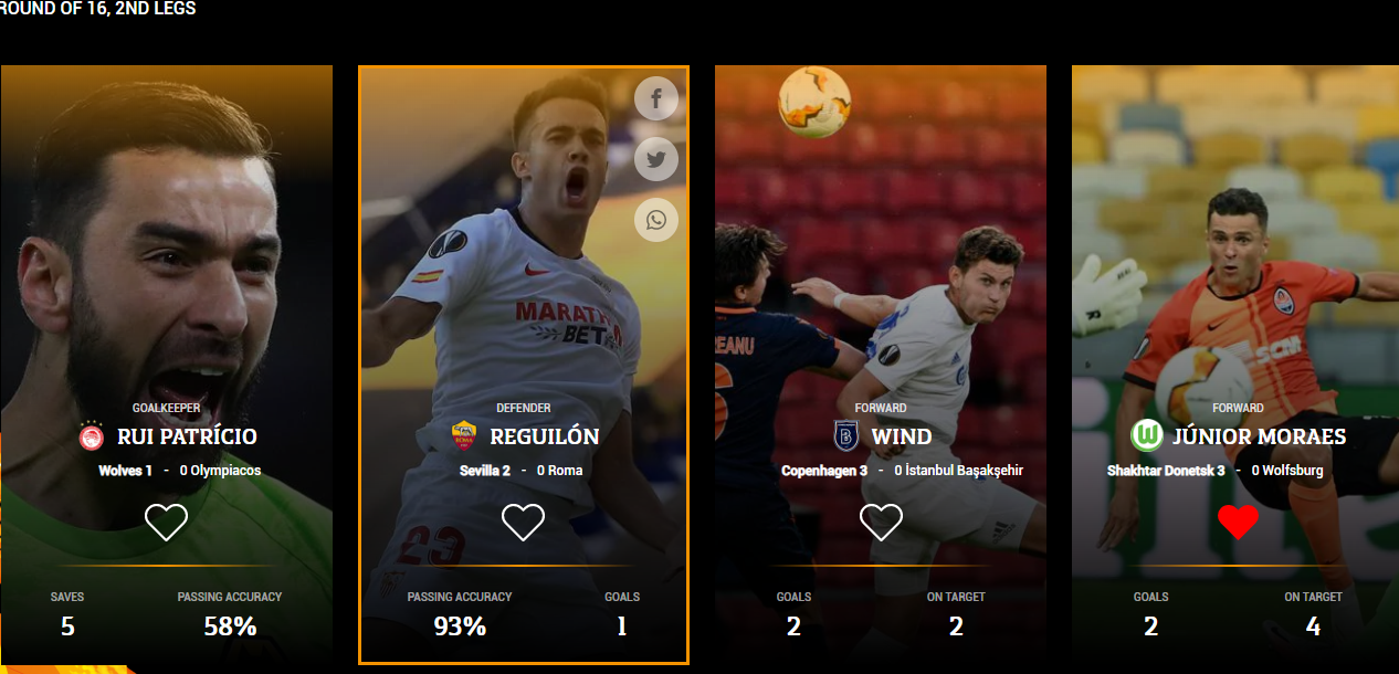 Кроме него в почетном списке претендентов на звание игрока №1 также Руй Патрисио, вратарь английского "Вулверхэмптона" (он сделал в матче против "Олимпиакоса" пять сэйвов), защитник "Севильи" - Регуилон (дубль в ворота "Ромы") и нападающий "Копенгагена" Винд (забил два мяча "Истанбулу").