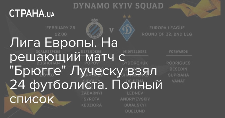 Завтра, 25 февраля, киевское "Динамо" проведет на выезде ответный матч 1/16 Лиги Европы против "Брюгге". Мирча Луческу взял в Бельгию 24 футболиста, которых ждет очень и очень непростой поединок (первая игра в Киеве завершилась вничью 1:1 - Ред.).