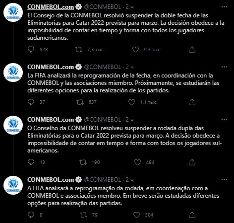 Конфедерация футбола Южной Америки объявила о решении отменить отборочные матчи квалификации на Чемпионат мира – 2022 в марте и провести их позже.